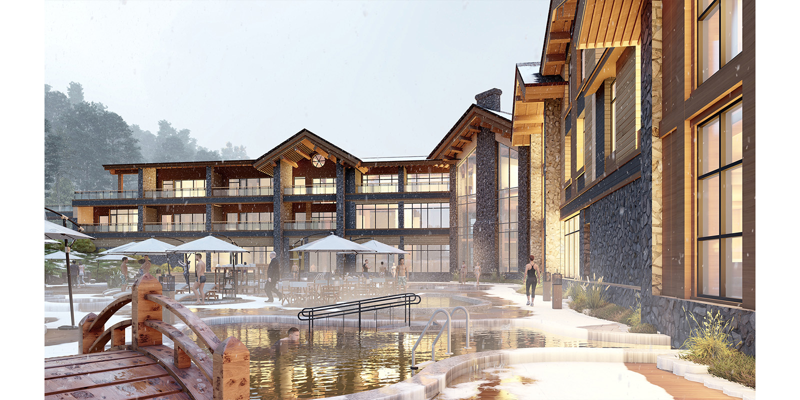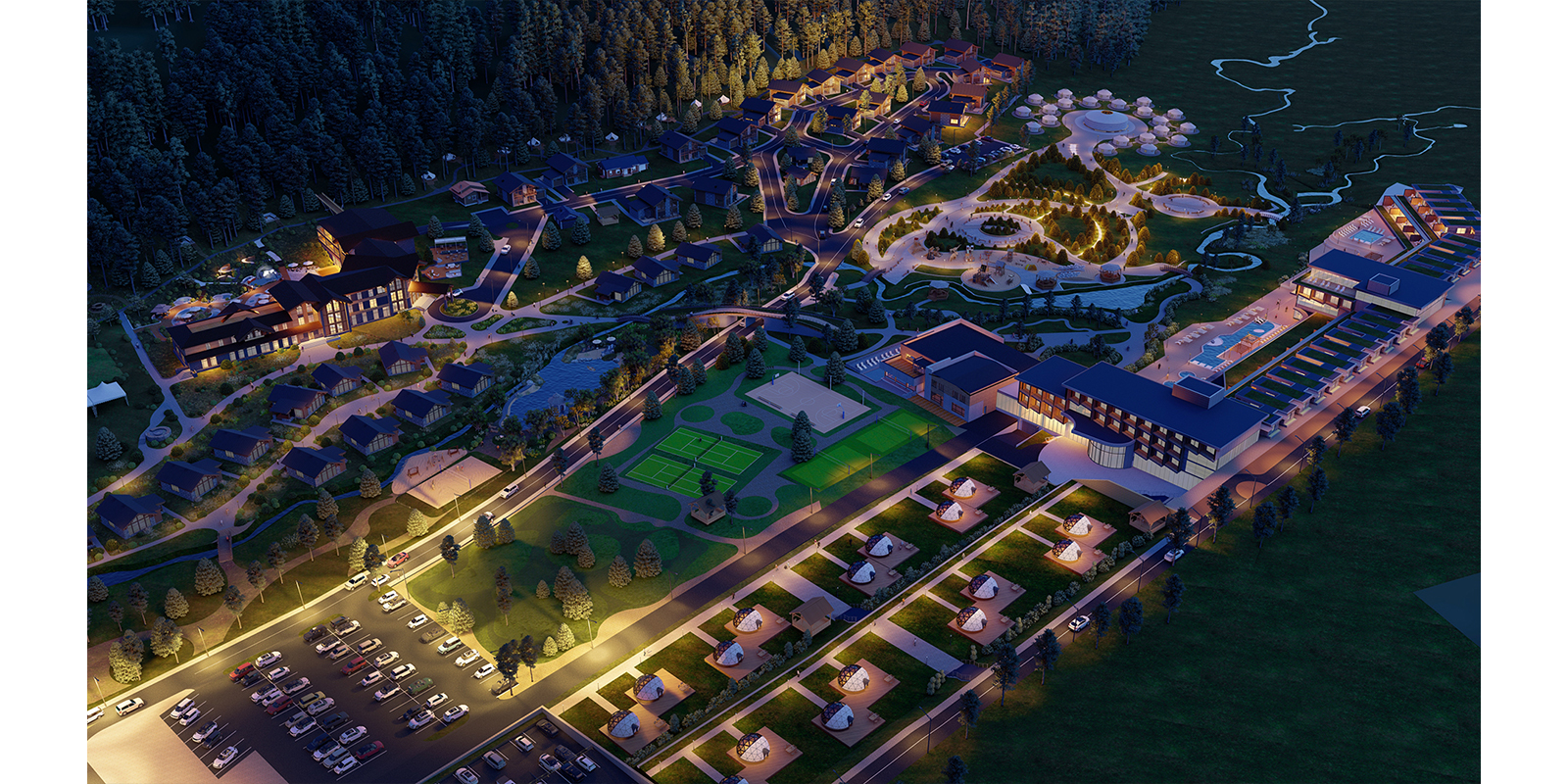 “DUUT Resort” is a popular hot spring holiday getaway resort. It is planned to redevel op the whole resort keeping the main building in its place. The masterplan consists of one main hotel and another smaller hotel where the hot spring is located, rentable single houses, glamping lodge tend, dome housing and traditional yurts for visitors. The center of the resort is planned with large green spaces with pond garden for customers to enjoy outdoor activities.