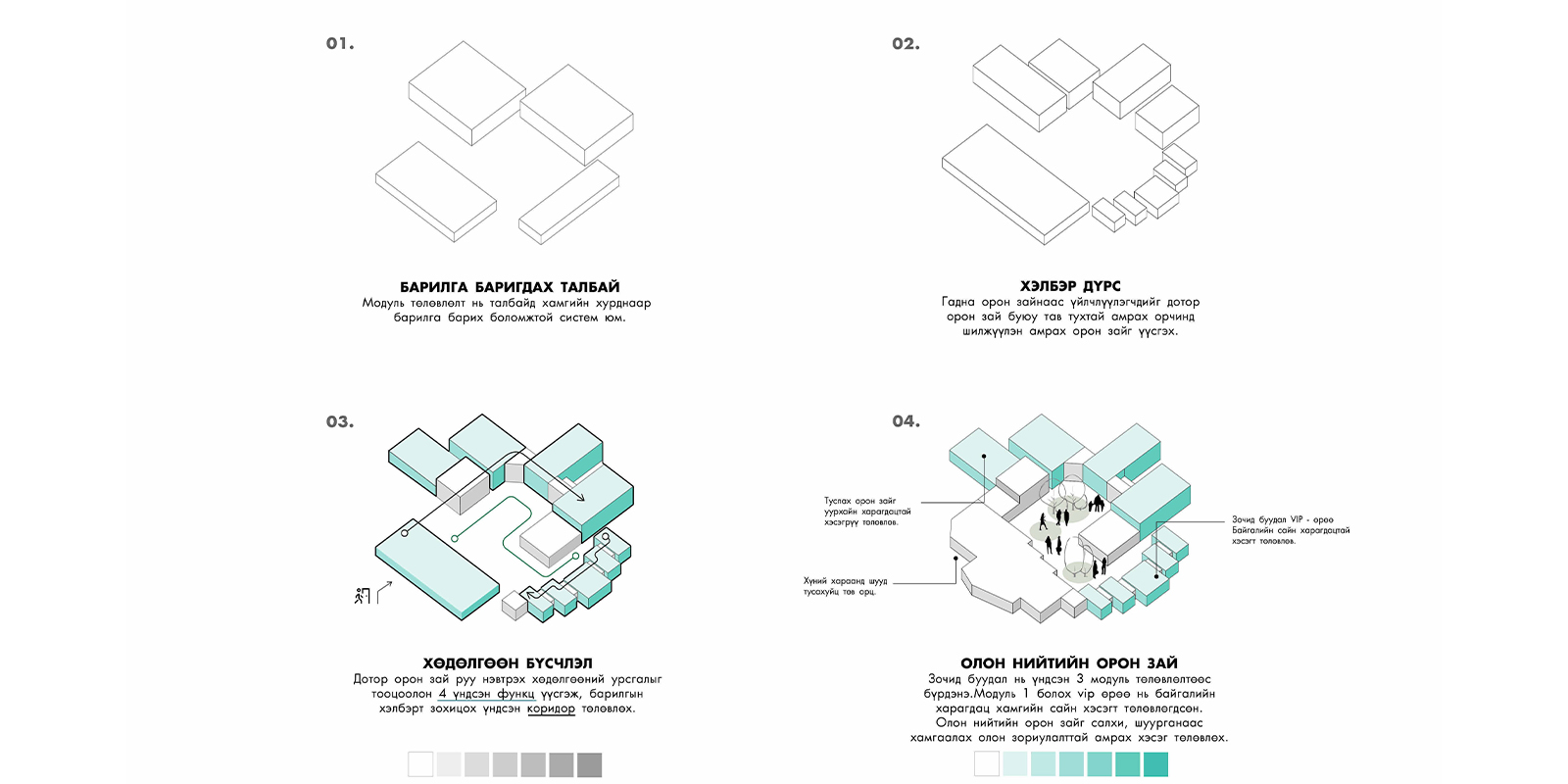“Төлөвлөж буй” болон “Одоо байгаа” барилга байгууламжуудын хоорондын уялдаа холбоог сайжруулахын тулд спортын талбай, авто зогсоол, зочид буудал зэрэг туслах байгууламжуудыг нэгтгэн төлөвлөсөн. Үүний зэрэгцээ, эдэлбэр газрын хэмжээгээр усны нөөц, ногоон байгууламж, гудамж, явган хүний орчны зохион байгуулалтыг оновчтой төлөвлөж, тухайн орчны онцлог, дүр төрхийг тодотгожээ.